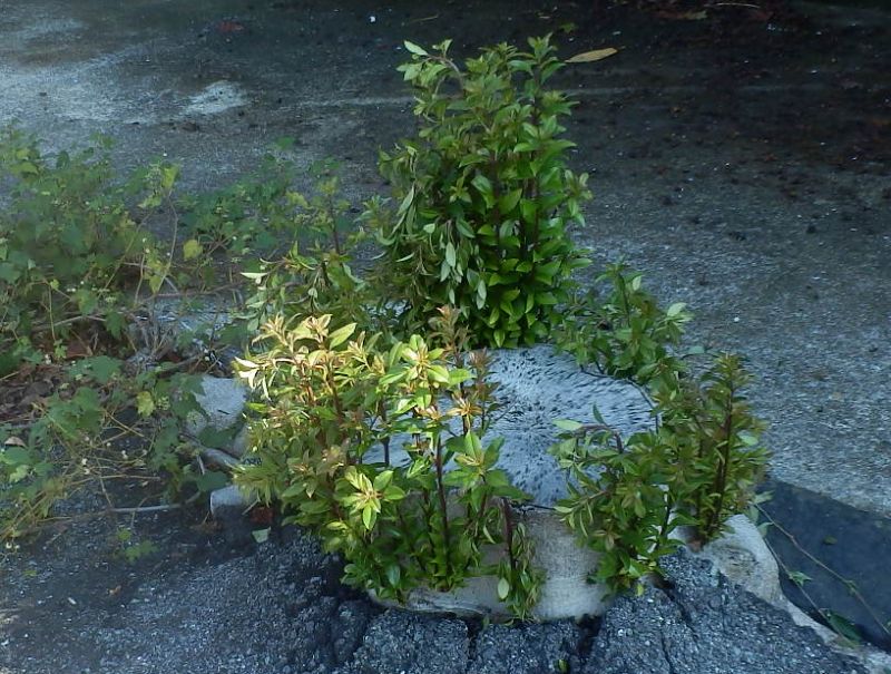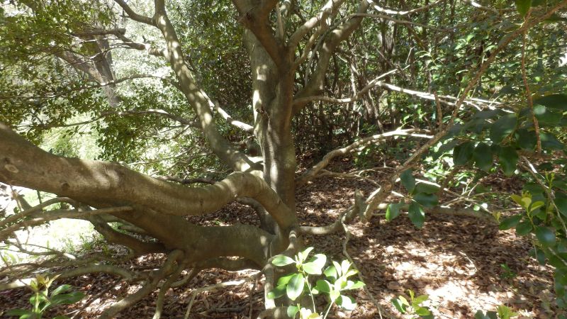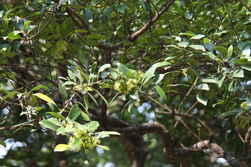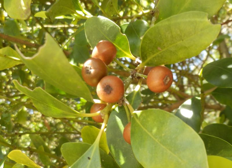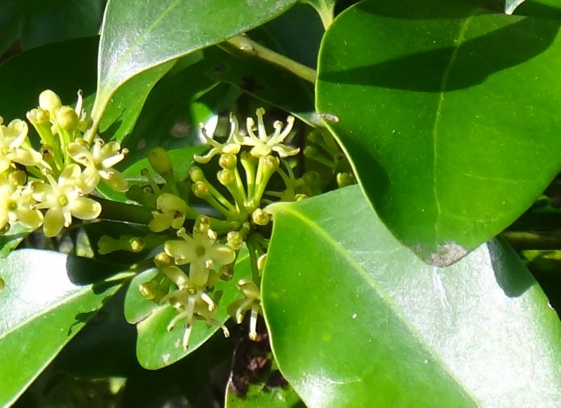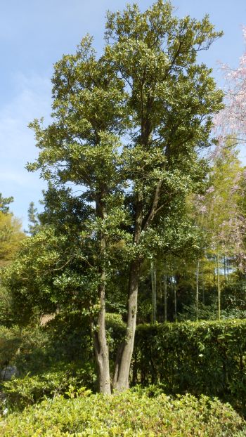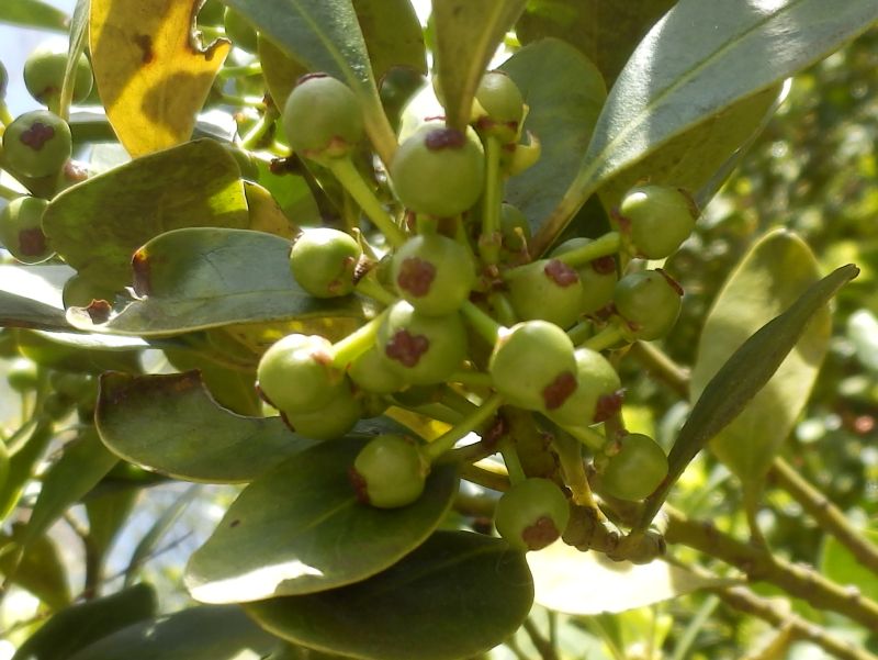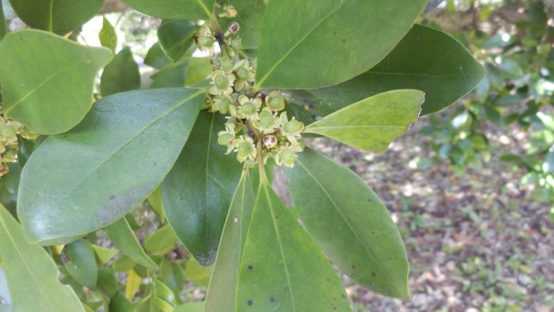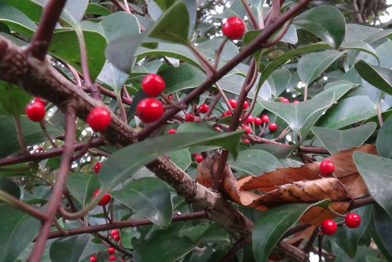 モチノキ :葉が厚くて黄味がかる、実は直径約1センチで1つの果柄に1つつく。