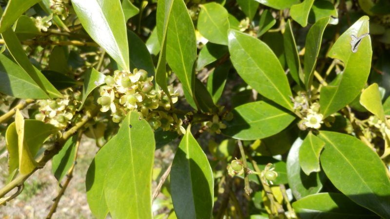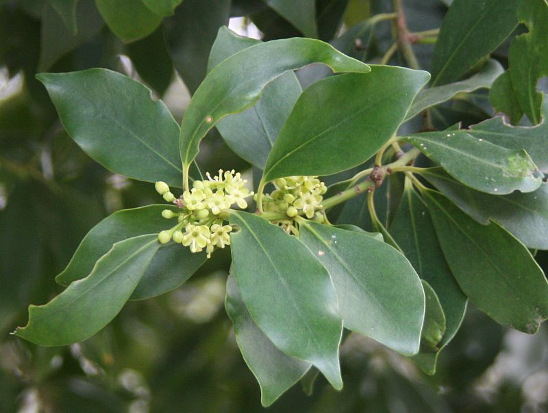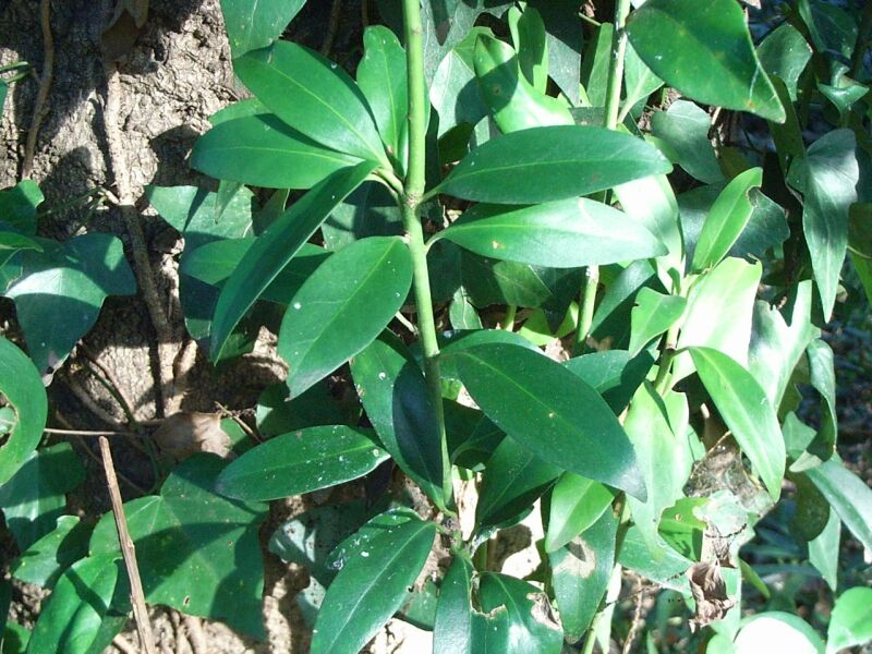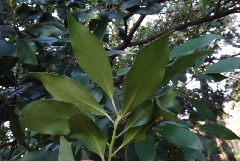 葉は先がとがり基部の細くなった楕円形で互生し、革質でつやがある。
