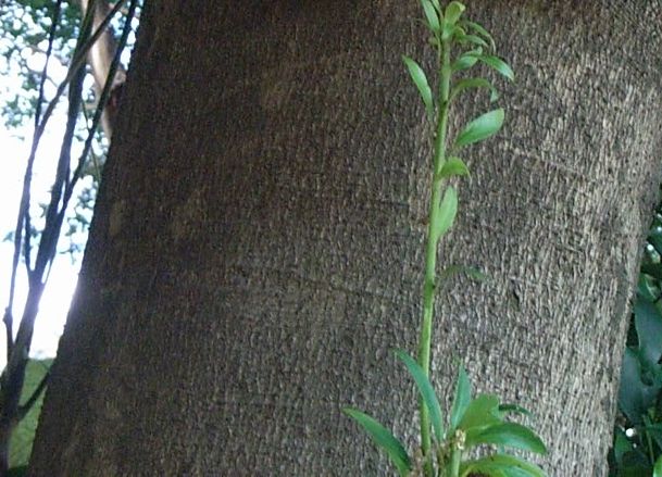樹皮は灰白色で滑らかであり、若枝は緑色で鈍い稜がある。