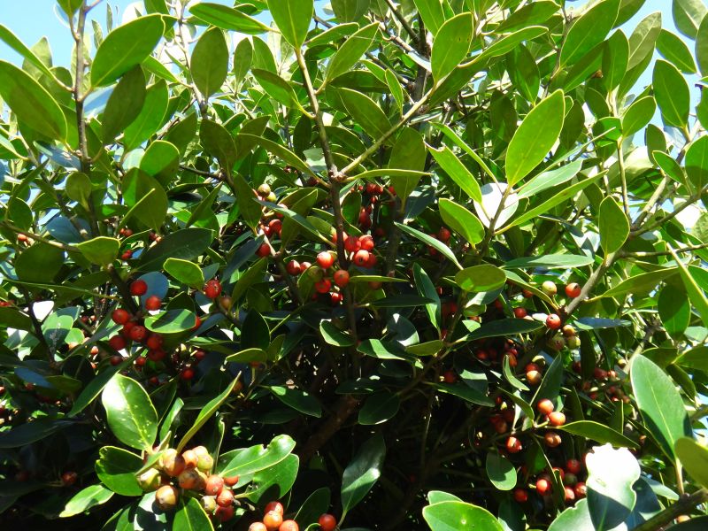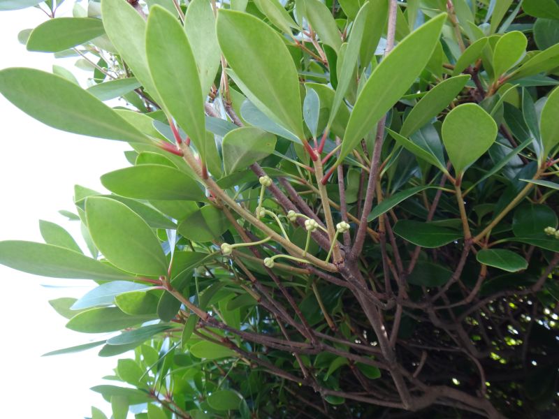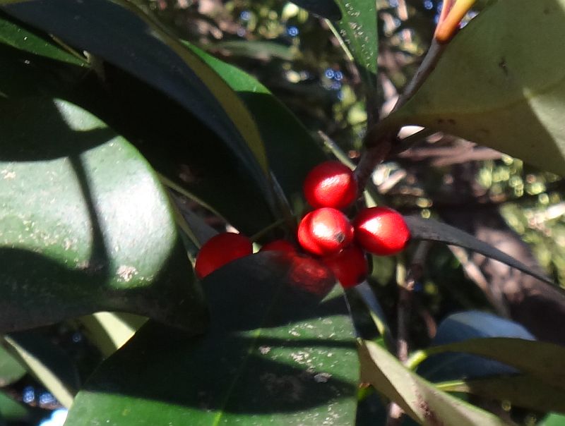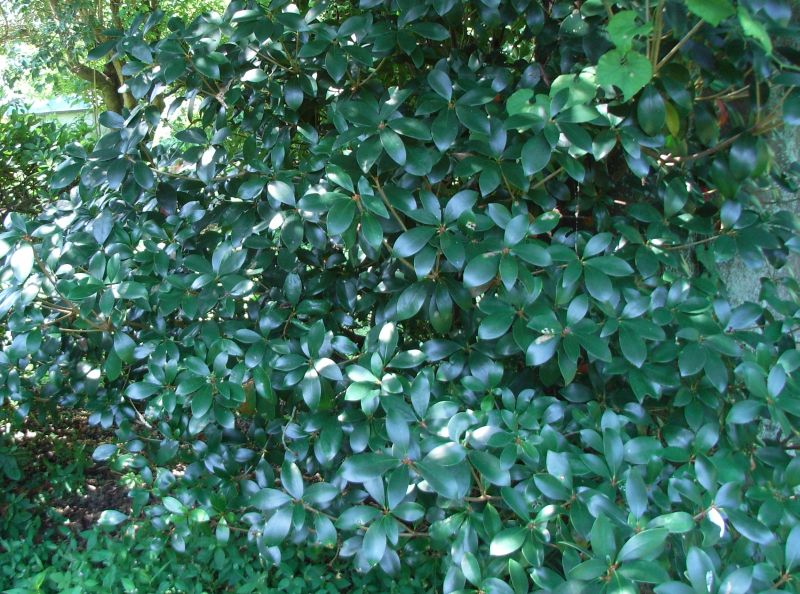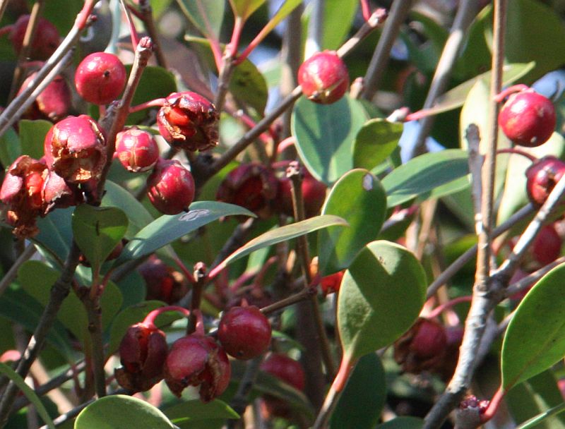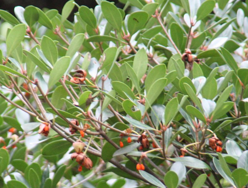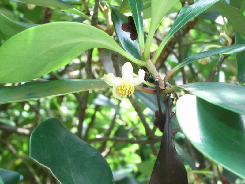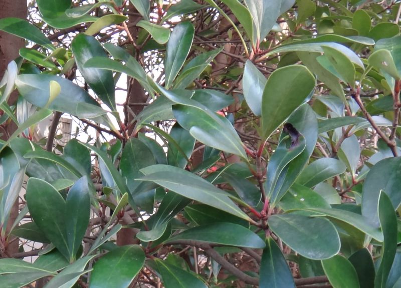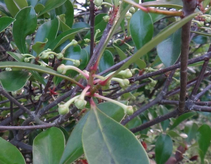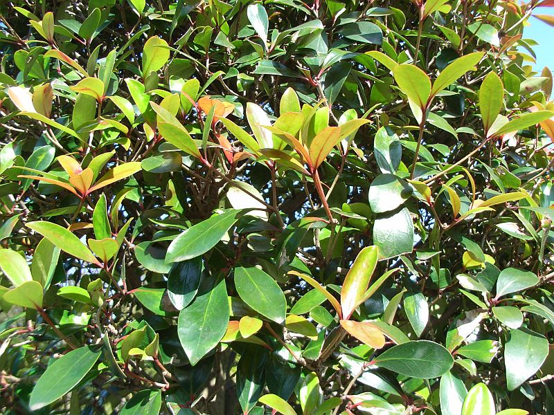 葉は全縁・革質の楕円状卵形で、枝先につく。