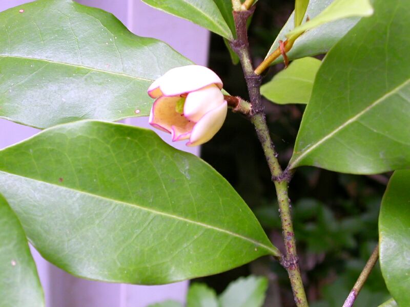 葉は厚くてつやがあり、花は6弁の黄白色で縁だけ紅色になり、バナナの香りがする