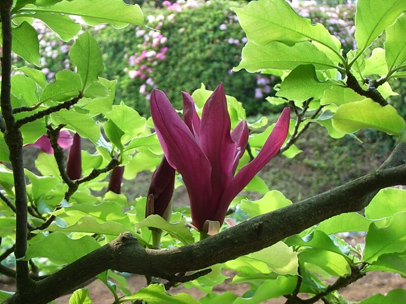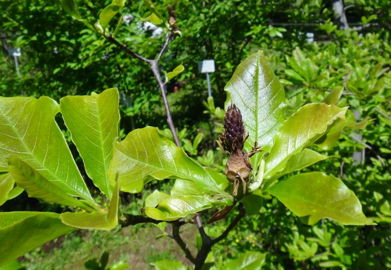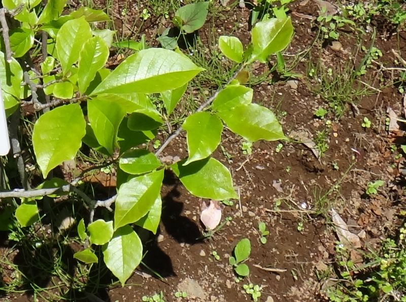 葉は長さ8〜18センチの倒卵形で先がとがり、葉柄は短く、全縁で、