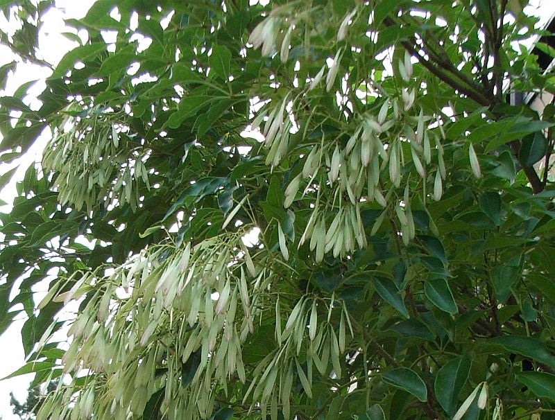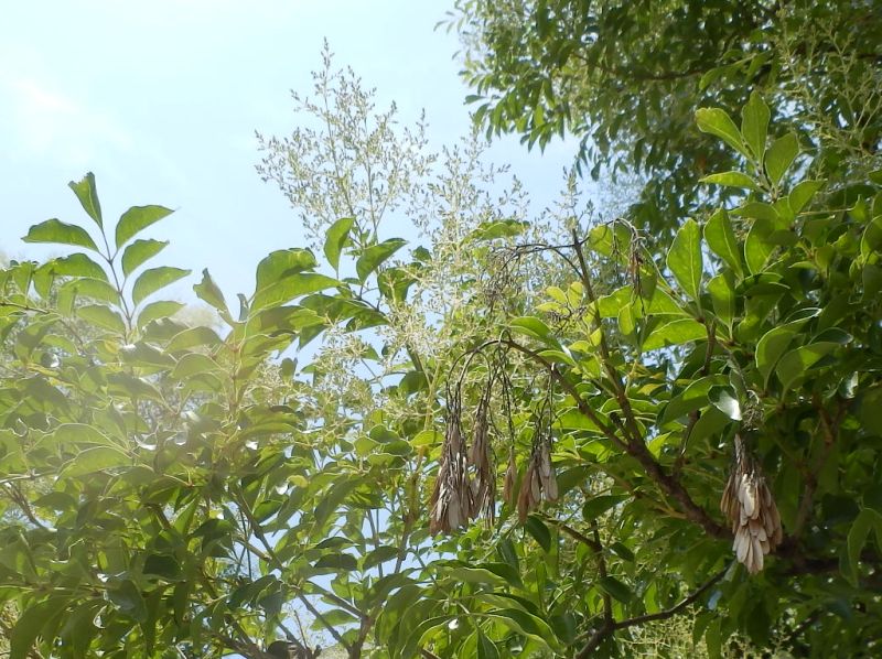 白い花を多数つけ、被針形の翼果がぶら下がる