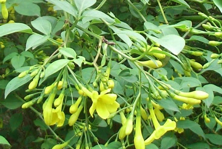 奇数羽状複葉が対生し、黄色い漏斗状の花が咲き、