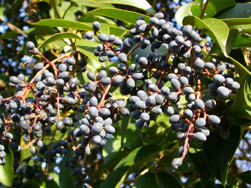 ネズミの糞のような楕円体の核果が黒紫色に熟す