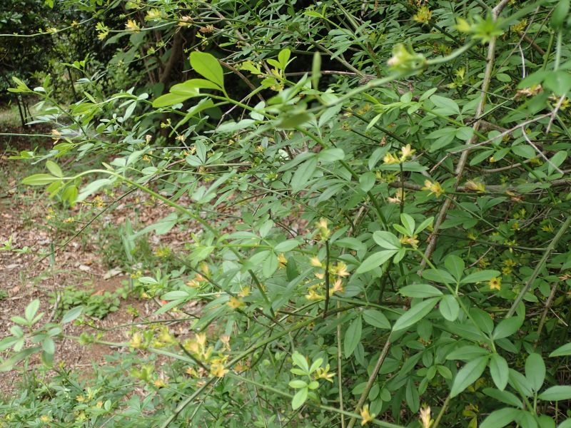 葉は有柄の単葉で、葉の出る前に2.5センチぐらいの黄色い花を枝に密につける