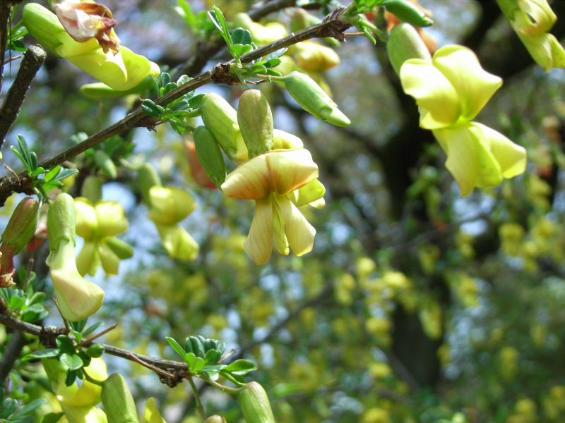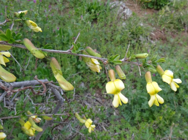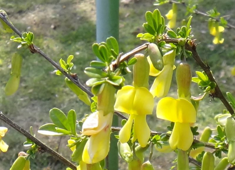 葉腋ごとに1つずつ咲く黄色い蝶形花は、花柄で枝から垂れ下がり、