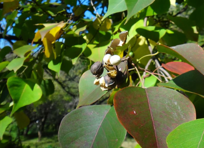 果実は熟してくると裂開し、蝋で覆われた白い種子が3つ現れる。