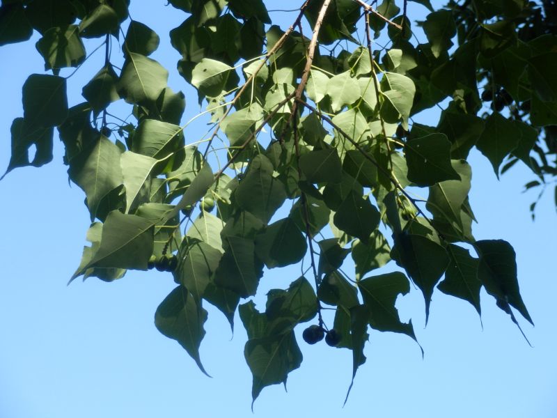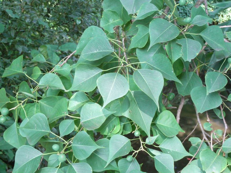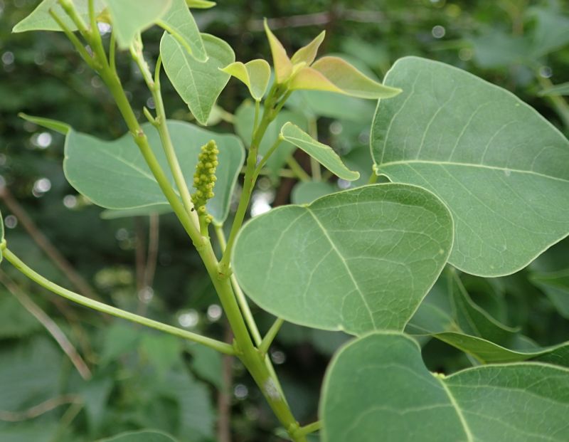 葉は先のとがった菱形状卵形であり、全縁で互生する。葉柄が長い。