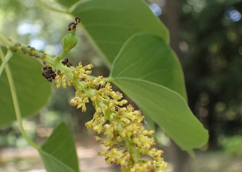 雌花は子房が膨らみ、雄花には2〜3ミリの柄がある。花弁はない。