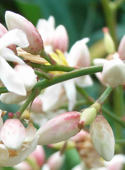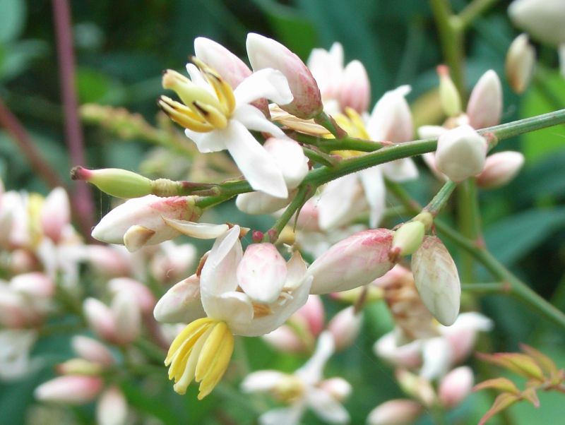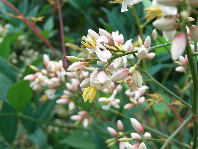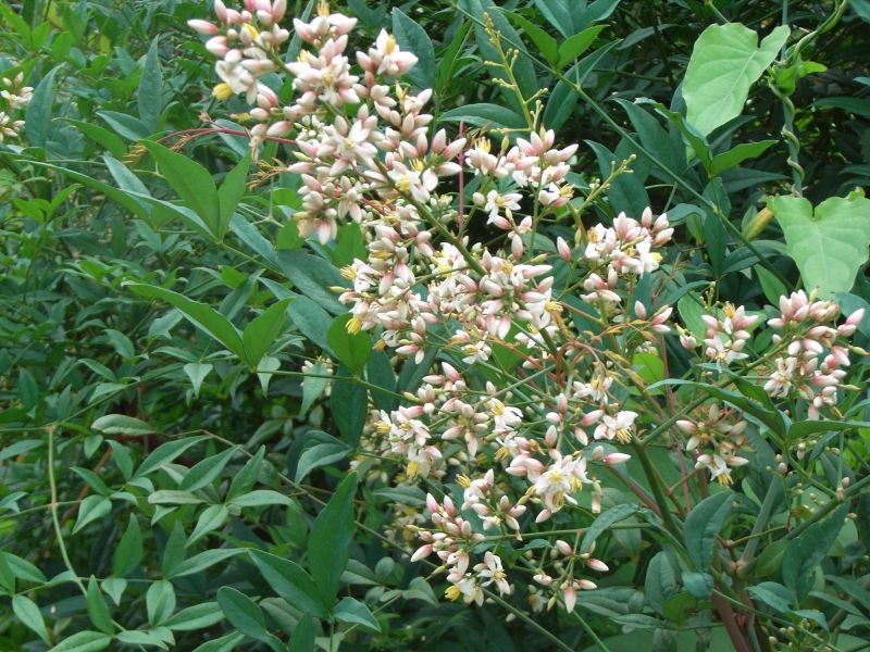 初夏に枝先に長い円錐花序を出し、白い小さな花をたくさん咲かせる。