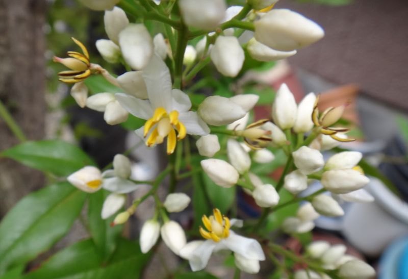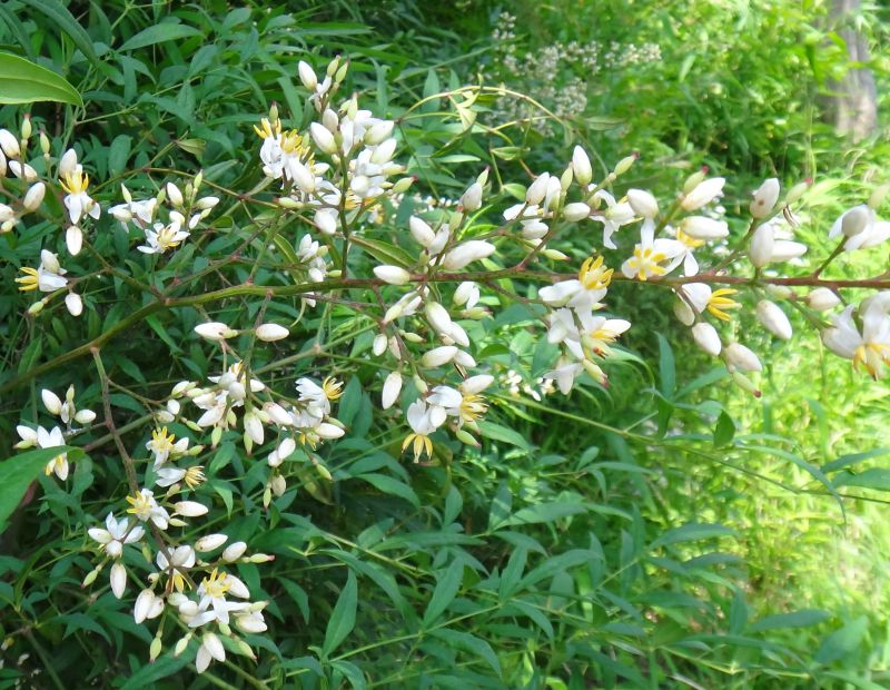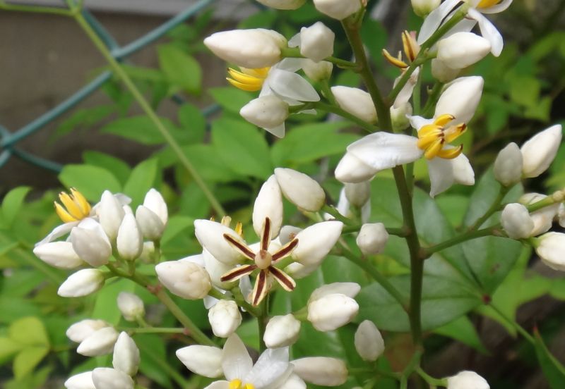 枝先から出る円錐花序に白い花が多数咲く。