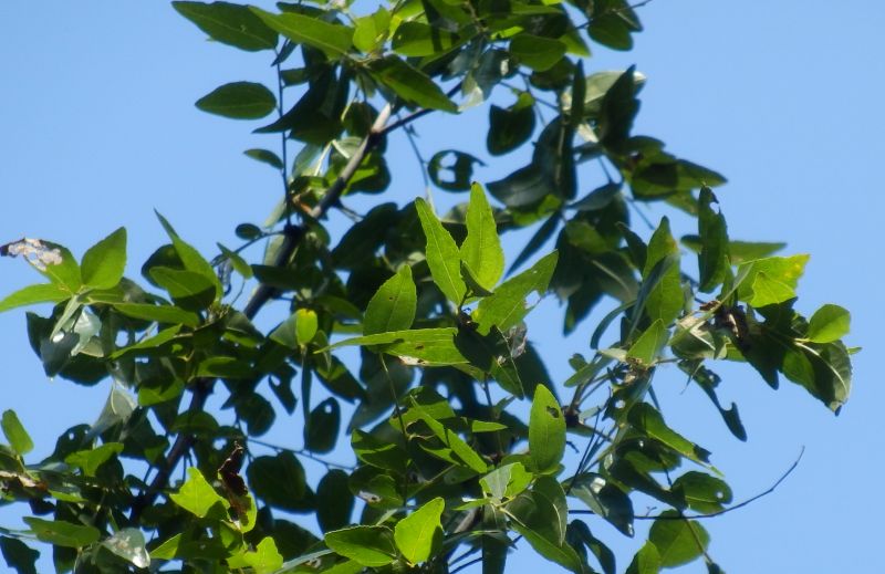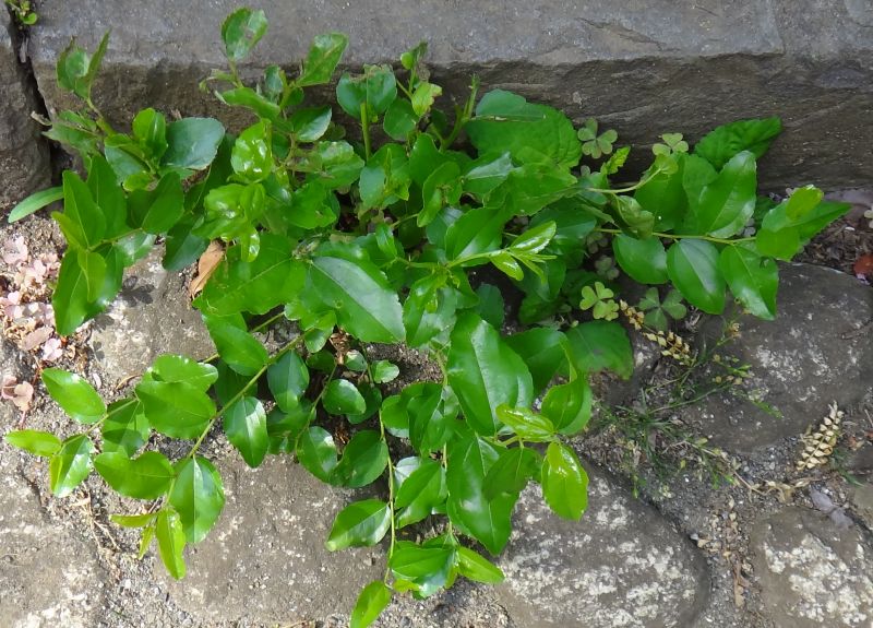 葉は卵状楕円形で、3脈が明瞭で、光沢がある。(2016/7/28)