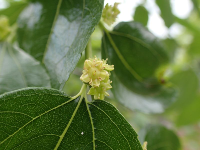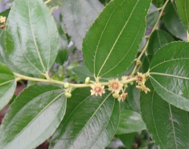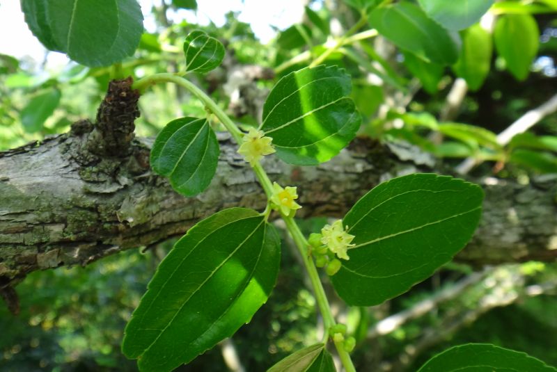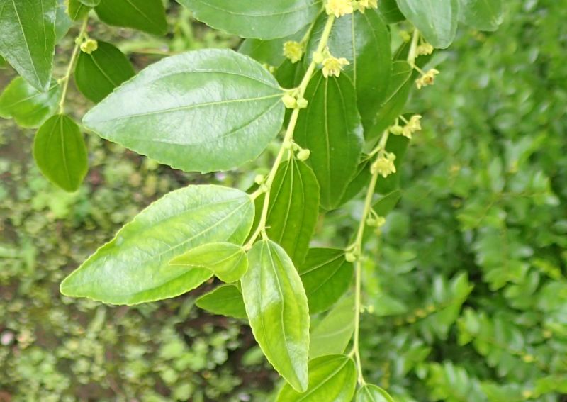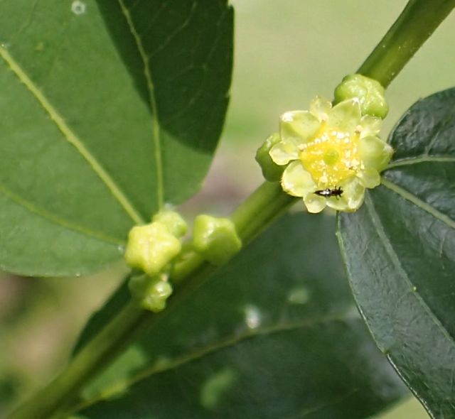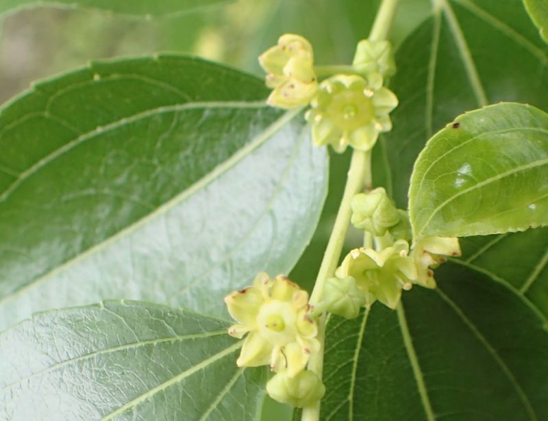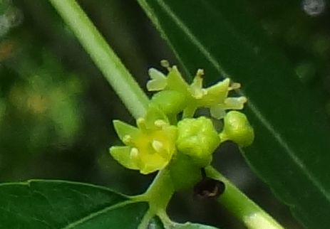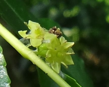 夏に小枝の葉腋に直径5〜6ミリの黄緑色の小さな5弁花を数個ずつつける。