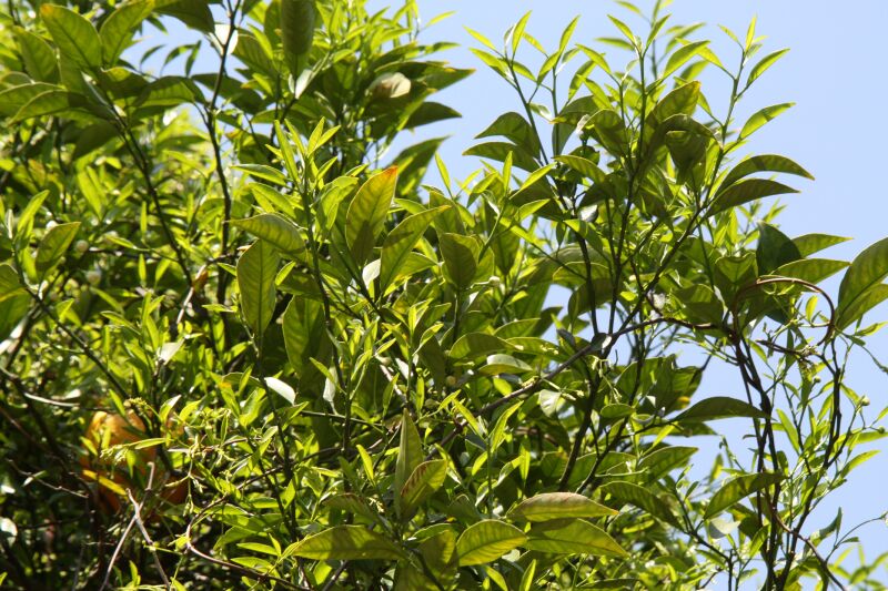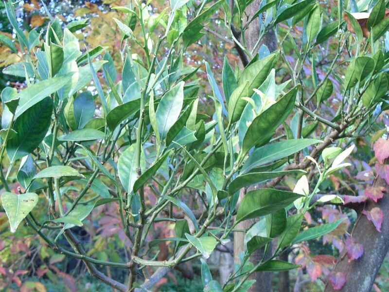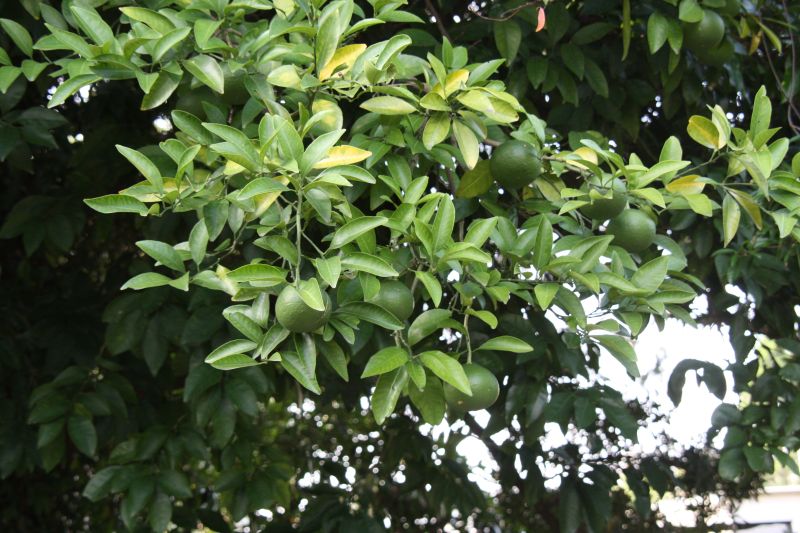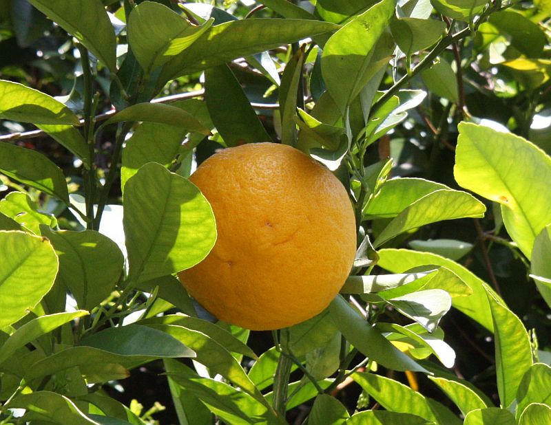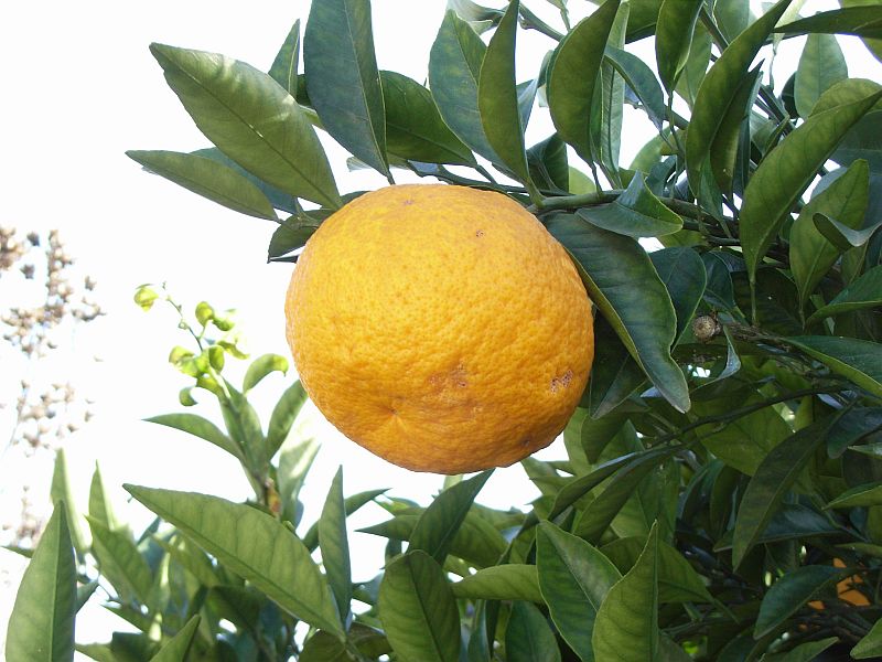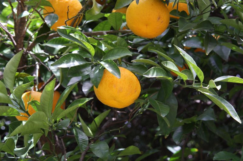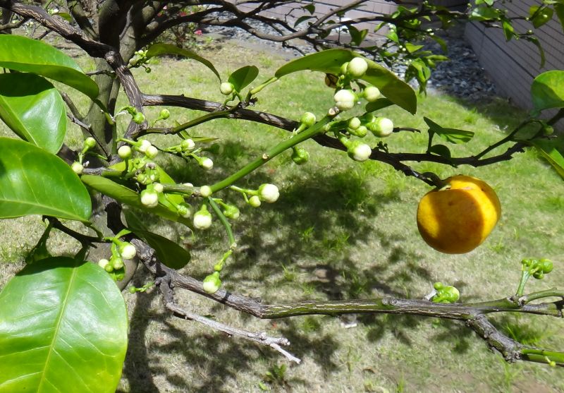 果実は球形のミカン果であり、翌年の4月〜6月に黄色く実る。