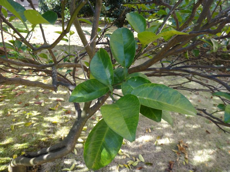 葉は先の細くなった楕円状被針形で、つやがあり、長さは約10センチ。(2016/11/26)