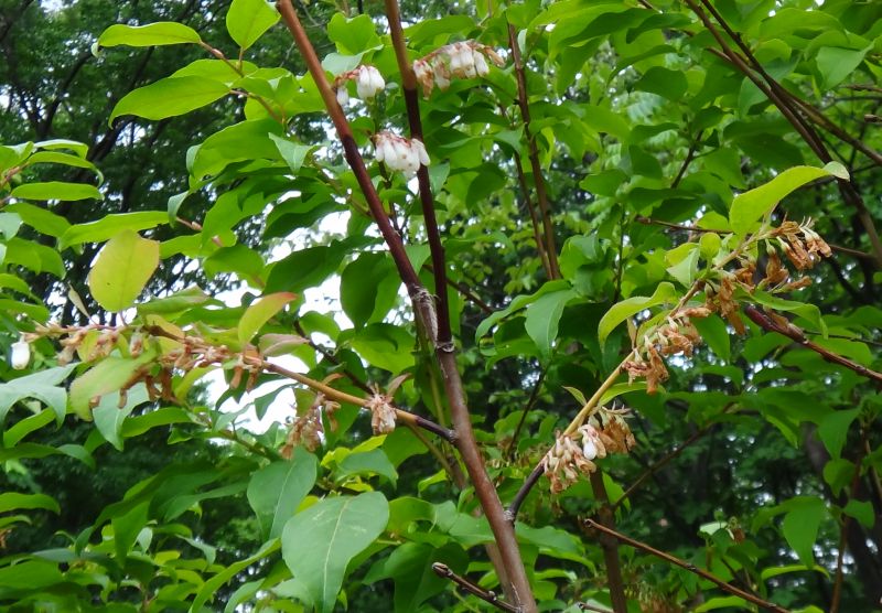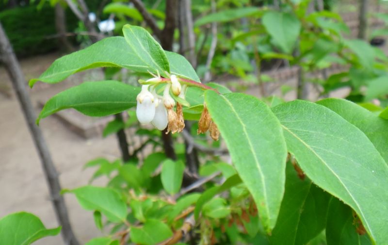 純白の壺形の花を下向きに一列にぶら下げて咲かせる。
