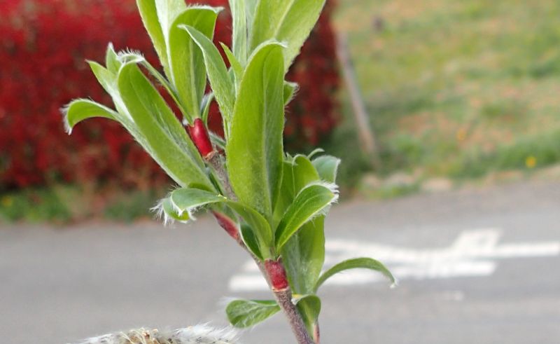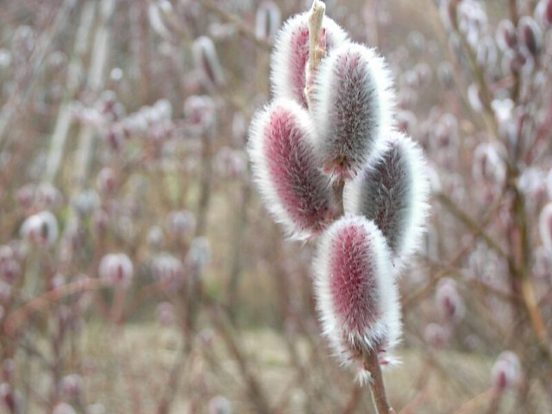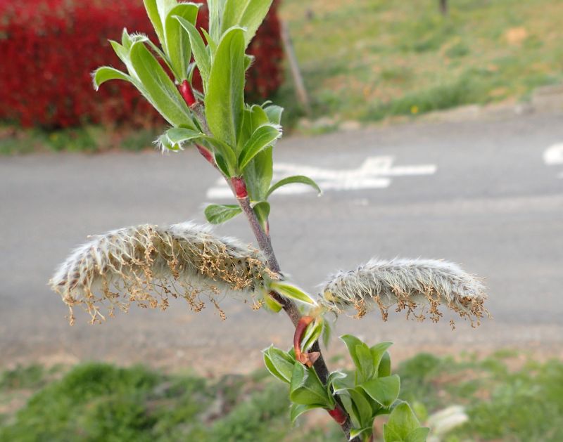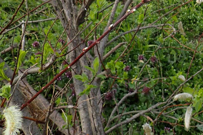 ネコヤナギ :高さ1〜5米、株立ち、葉先尖る、細鋸歯、若枝紫緑色。