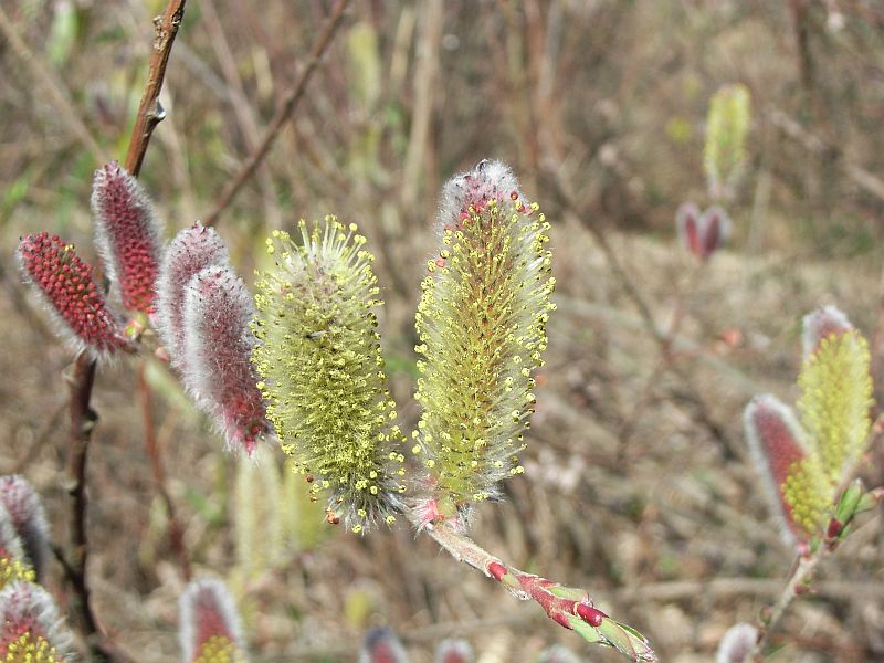 雌雄異株で、双方とも、早春に長楕円形の花序を枝に互生させ、
