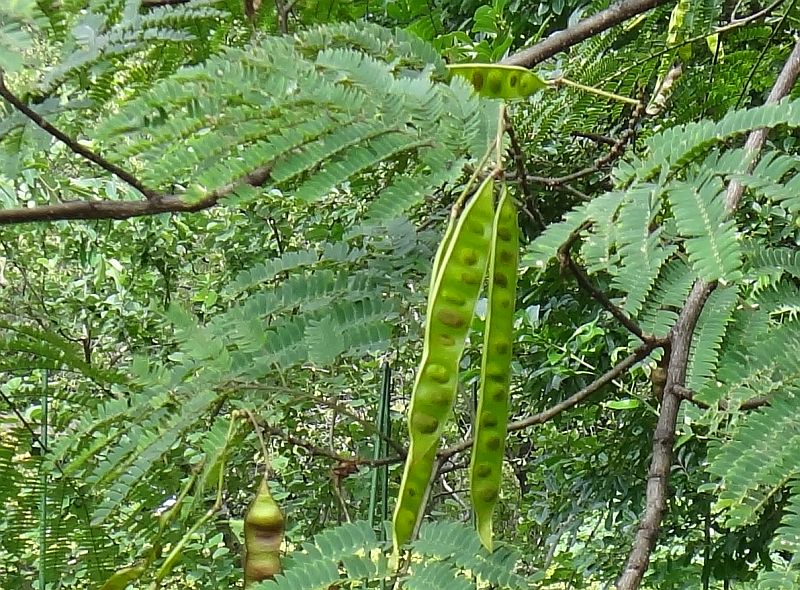 果実は長さ10〜20センチの扁平な豆果で、種子の間でくびれ、