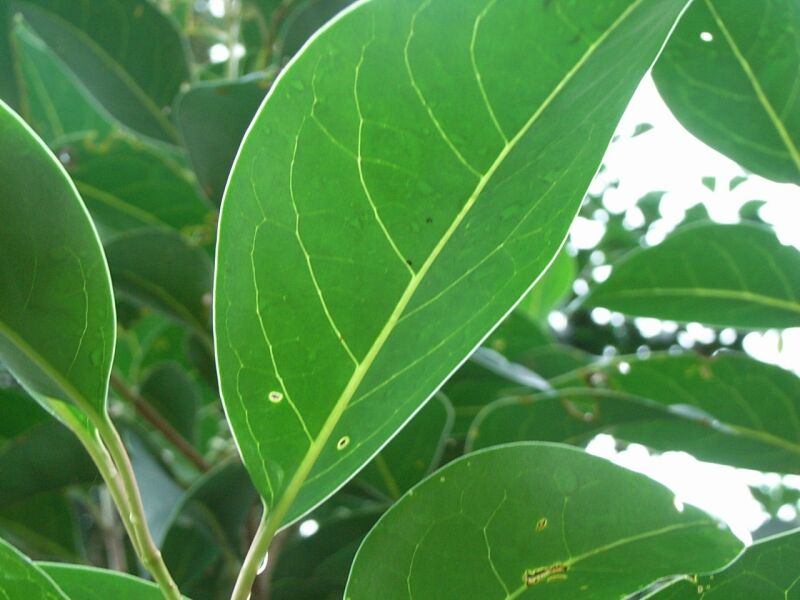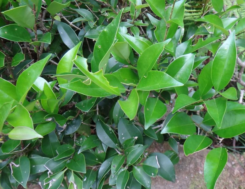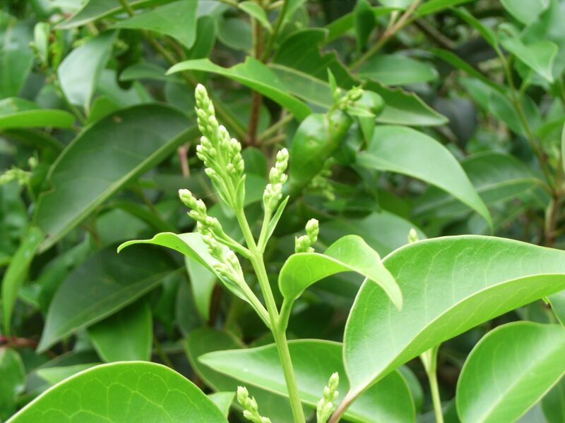 葉は全縁で長さ4〜8センチの広卵形で、暗緑色で革質であり、対生する。