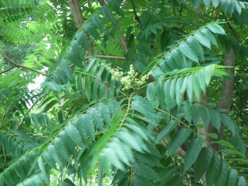 葉は奇数羽状複葉、小葉は長卵形で、 円錐花序に緑白色の小さい5弁花を多数つけ、 数個の分果に分かれた翼果をつける