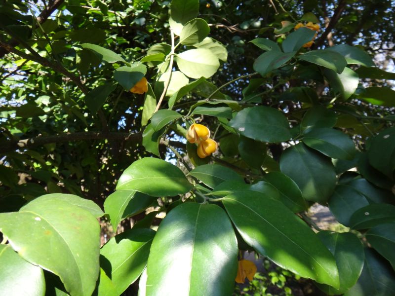 四角形の朔果が黄褐色に熟すと、赤い種子が現れる