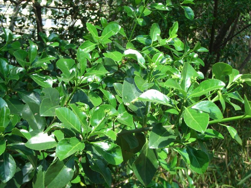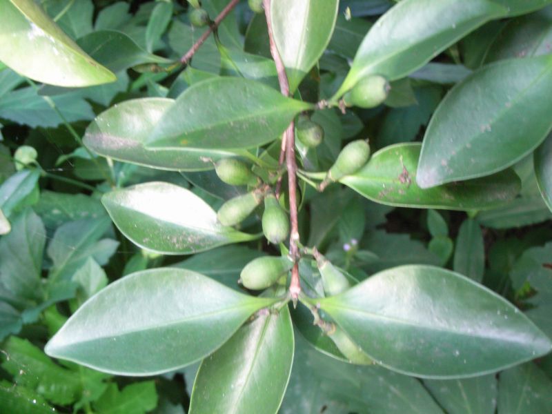 葉は厚くて光沢があり、夏に小さい緑白色の花をつけ、