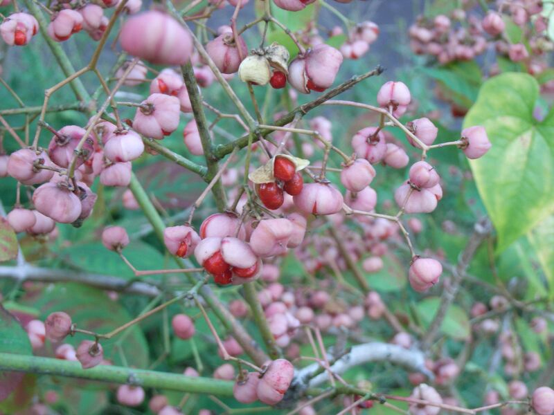 果実は朔果で晩秋に4〜5裂し、赤い仮種皮に包まれた種子を出す