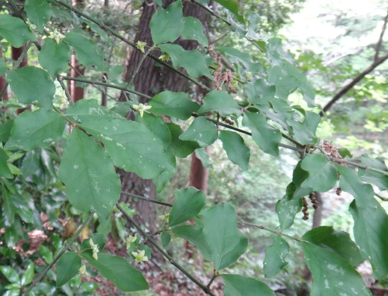 葉は楕円形で浅い鋸歯があり、葉腋に黄緑色の花を数個つけ、