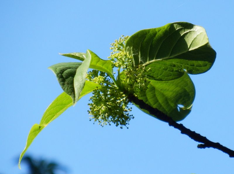 枝先の葉腋に黄緑色で小さい花が散房状に咲く。(2017/5/2)