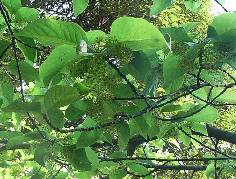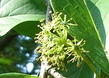 花は黄緑色で小さく、枝先の葉腋に散房状につく。