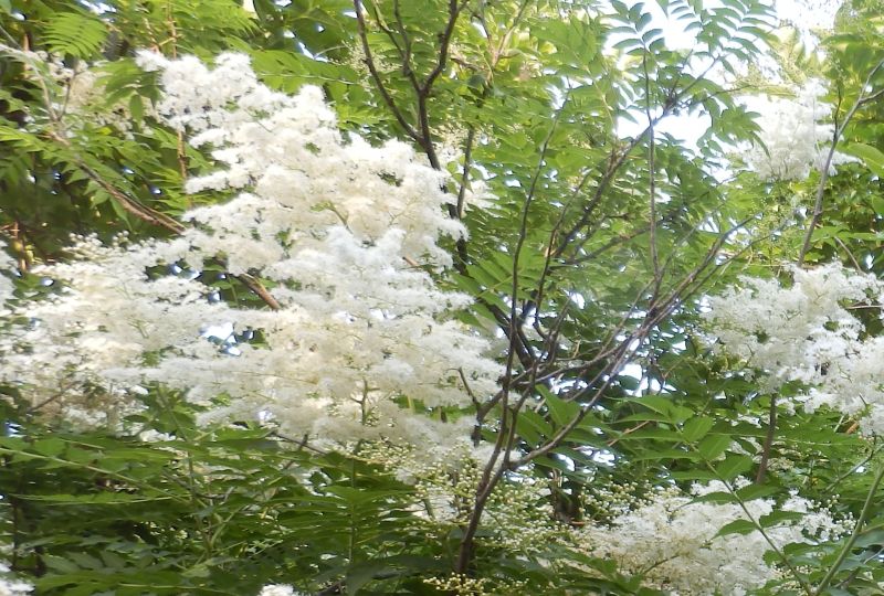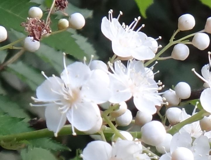 夏に枝先に円錐花序を出し、直径5〜6ミリの白い5弁花を多数つける。