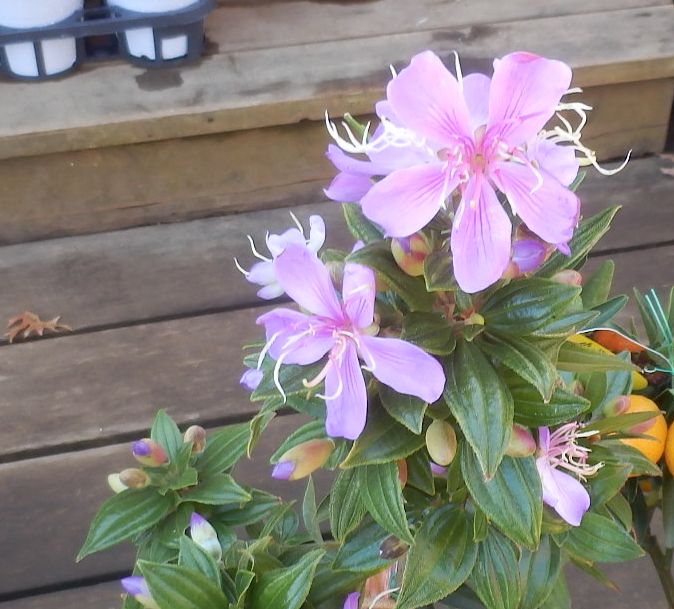 葉は尖った卵形で葉脈が明瞭であり、 5弁の淡紅色の花が咲く