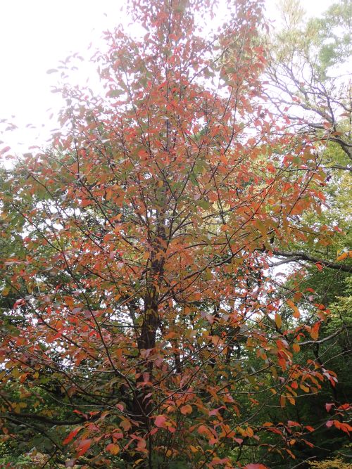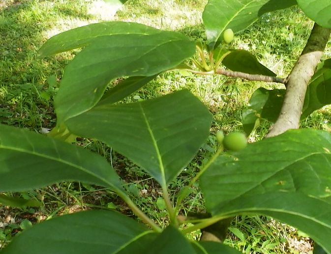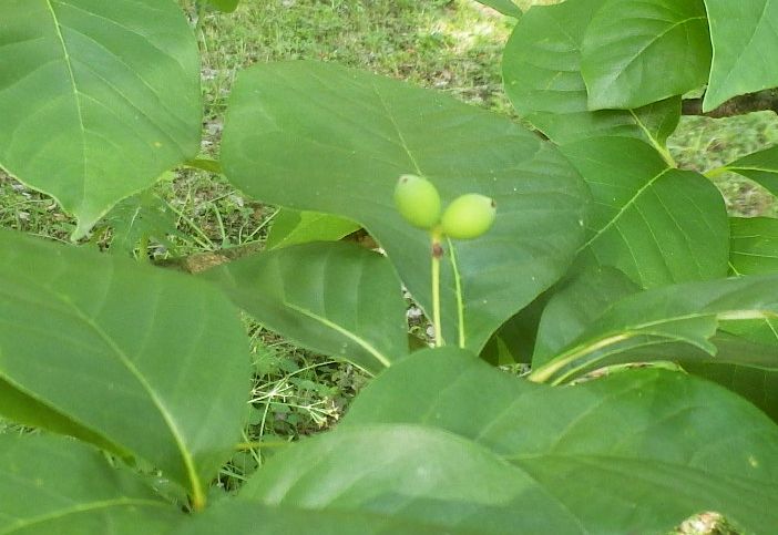 長い果柄の先に、長さ8〜12ミリの楕円形の核果が数個つき、