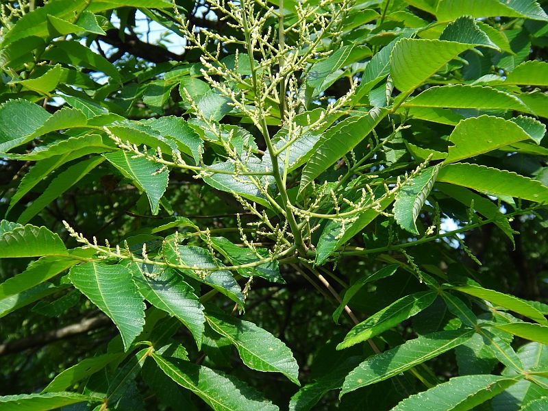 枝先に円錐花序を出す。小葉は先のとがった長楕円形で、鋸歯がある。(2012/7/25)