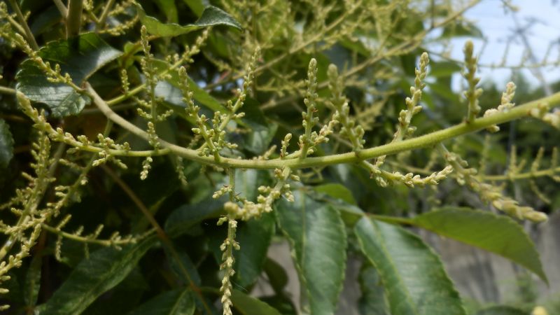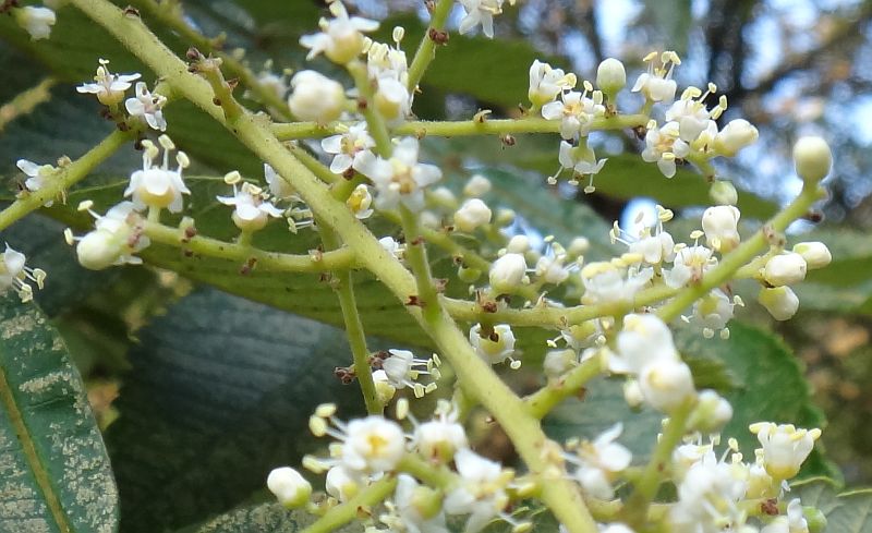 夏に枝先から出る円錐花序に白い小さい5弁の花を多数つける。