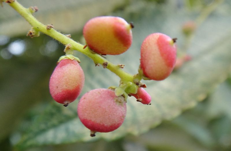 果実は直径4ミリぐらいの扁球形の核果で、10月〜11月に黄赤色に熟す。