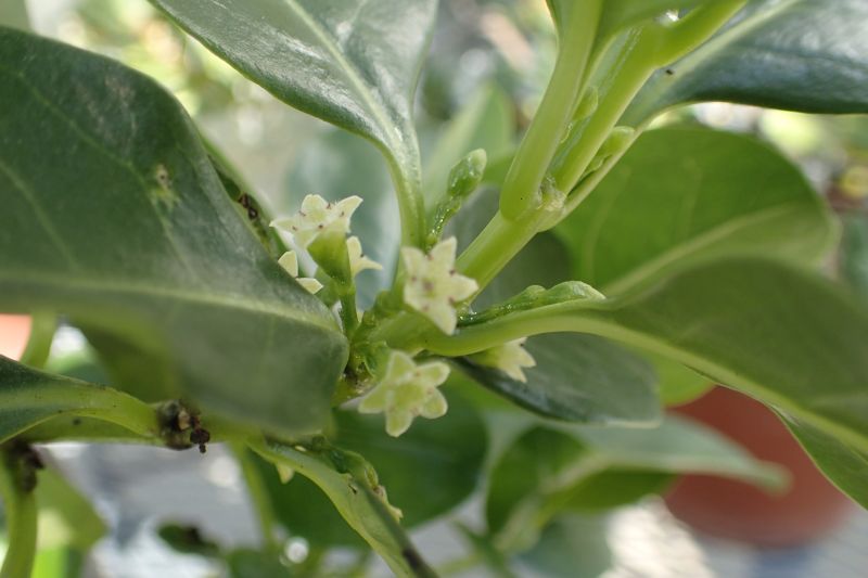 葉腋に淡緑色で漏斗状の花を数個つける。