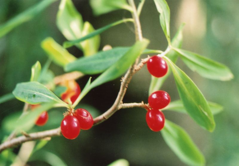 楕円形の液質の核果が葉腋に数個つき、初夏に赤く熟す。