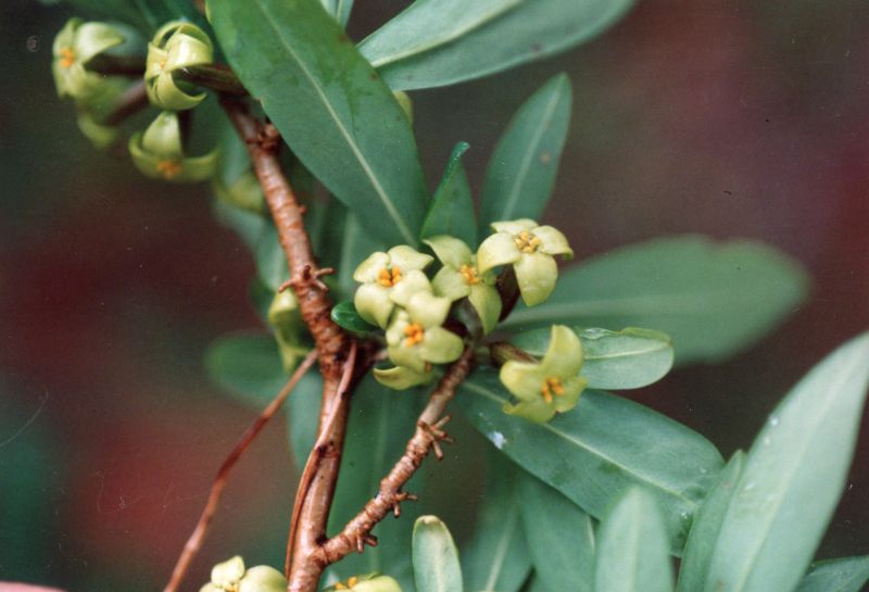 雌雄異株で、葉腋に黄緑色の小さな花が束生する。