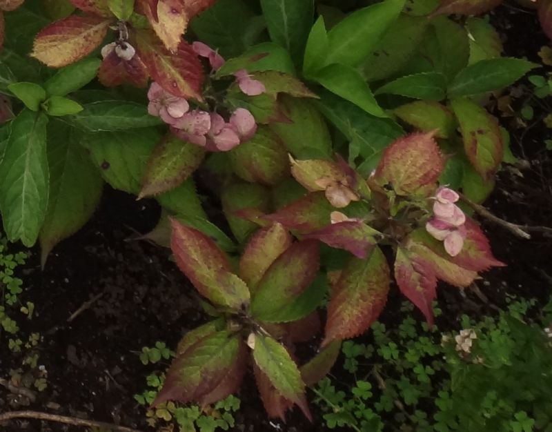 装飾花の萼片は、はじめ淡紫色で、やがて淡紅色に変わる。