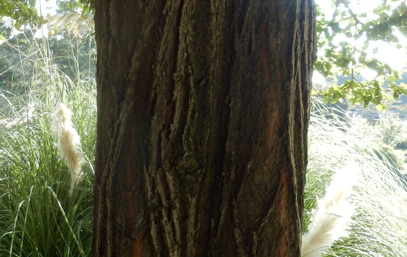 樹皮は暗灰色で、縦の裂け目がある。