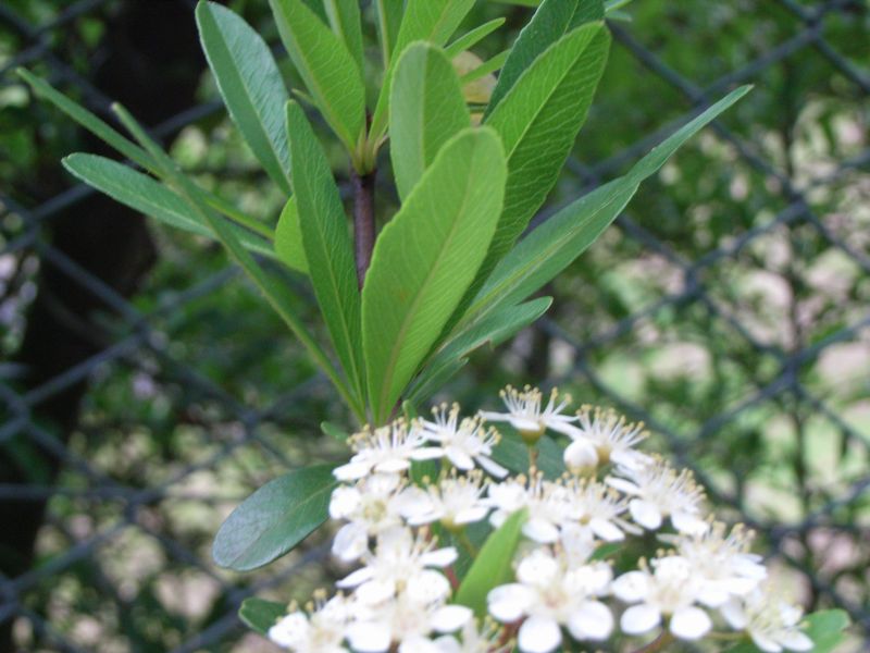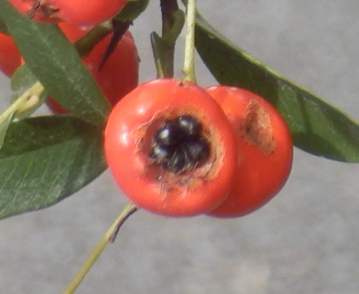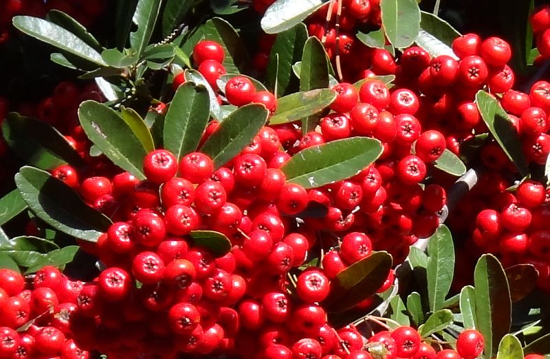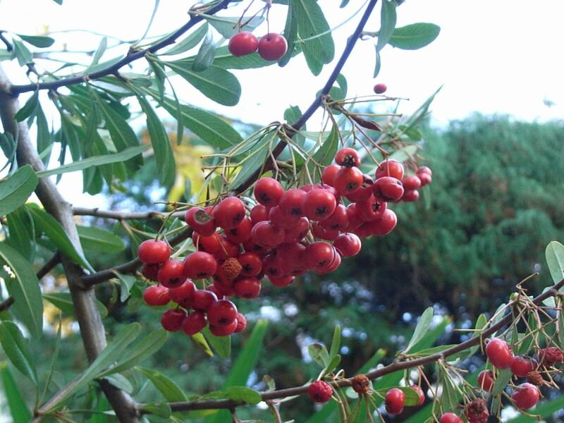 トキワサンザシ :葉は2〜4センチの倒披針形、果実は鮮紅色