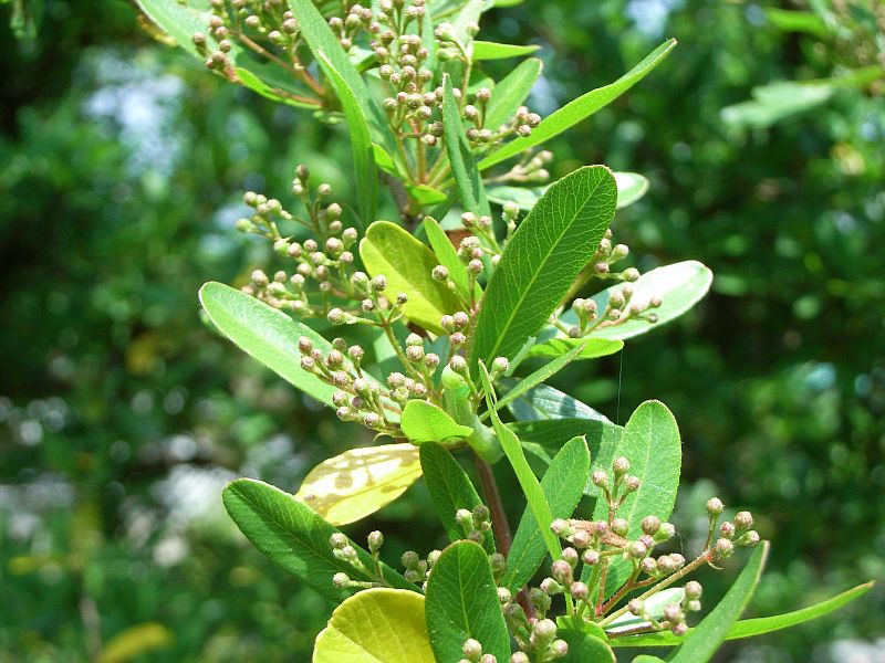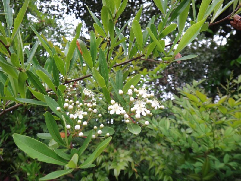 タチバナモドキ :葉は5〜6センチの狭長楕円形、葉裏に灰白色の毛が密生、果実は橙黄色