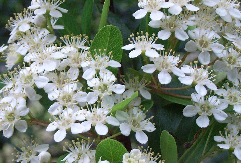 短枝先の散房花序に白い5弁花が多数咲く。トキワサンザシ?