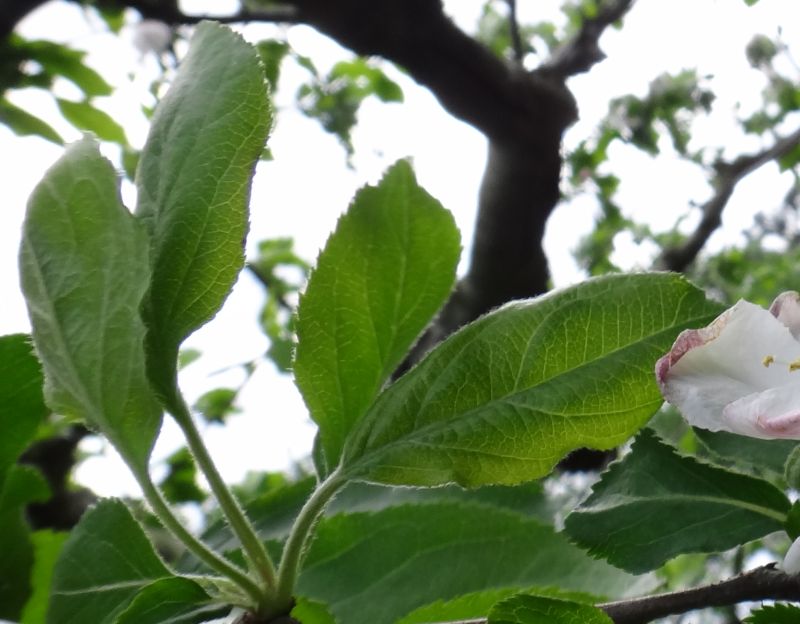 葉は長さ6〜13センチの楕円形〜卵形で互生し、鈍い鋸歯があり、