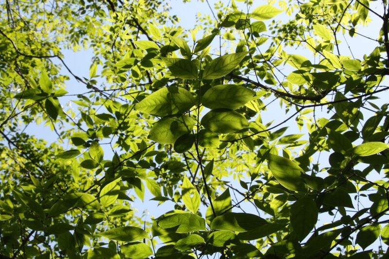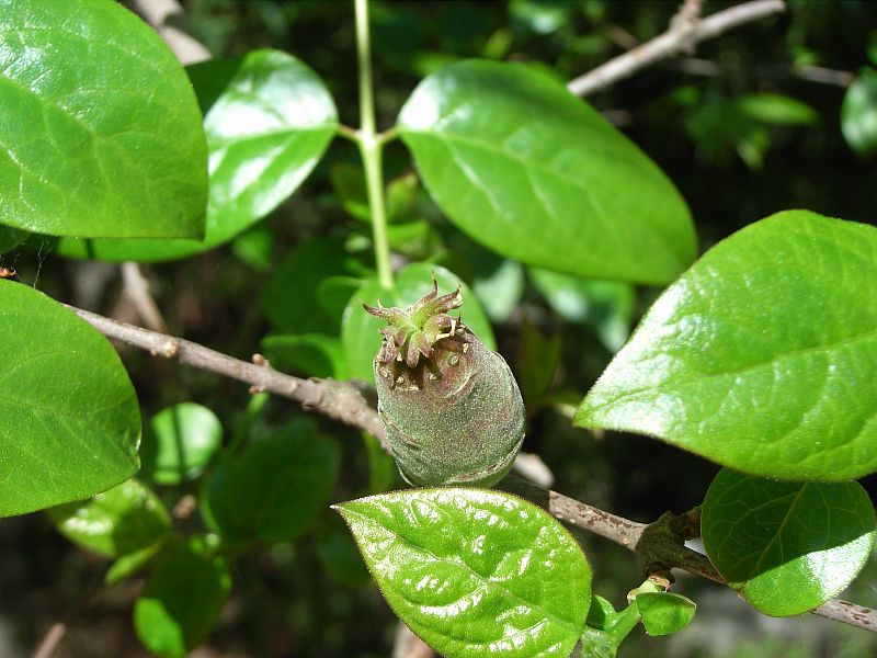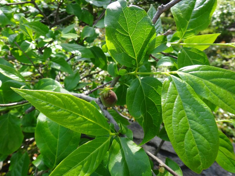 ロウバイの葉は先のとがった全縁の卵形で、対生する。
