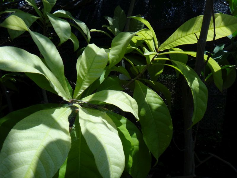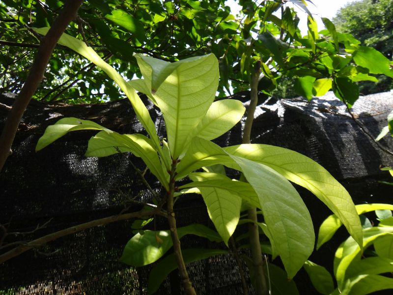 葉は先の尖った大きな楕円形。若葉の葉柄が赤い。
