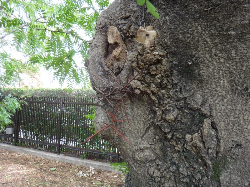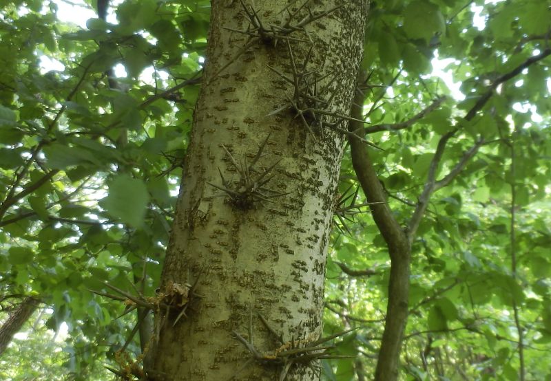 幹は直立し、樹皮は黒褐色で、幹や枝に多数の長い棘がある。